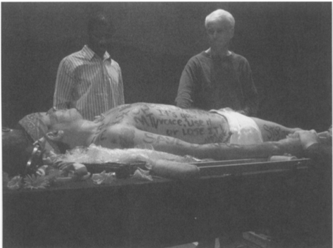 In Guillermo Peña’s Mapa/Corpo 2: Interactive Rituals for the New Millennium, everyone in the performance space is involved in creating a new history for the artists and the people the artists represent. “This is evident from the moment the audience enters the performance space and sees two bodies lying motionless on gurneys. These are part of a visual code that refers to pain and, simultaneously, to healing. The actions throughout the performance unfold as a metaphorical healing ritual enacting the decolonization of the bodies lying on gurneys” (Seda and Patrick 135).