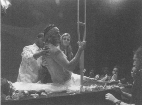 When both bodies have been decolonized with the audience’s help, the performers look each other in the eyes, as if recognizing and acknowledging each other. The performers’ bodies in Mapa/Corpo 2 become La Pocha Nostra’s artistic canvas. They function as intentional instruments of artistic agency that display the effects of colonization and violence. Thus, the bodies represent the memory of violence against the Other; they create a narrative of resistance to violence and colonization. This resistance can be understood from the multiple perspectives of gender, ethnicity, and nationality. If, as Richard Schechner has argued, “There are no clear boundaries separating everyday life from family and social roles or social roles from job roles, church ritual from trance, acting onstage from acting offstage, and so on, ‘the per formers’ genders and multiethnic backgrounds also contribute to the overall meaning of Mapa/ Corpo 2’. Thus, the individual body becomes emblematic of everybody that has endured pain, violence, discrimination, and colonization. In other words, the performers’ bodies play a vital role in this cross-cultural analysis of violence and colonization in which art becomes a holistic weapon aimed at decolonizing the body politic. Seda and Patrick 139